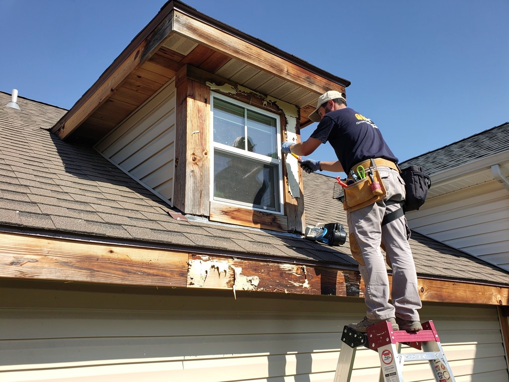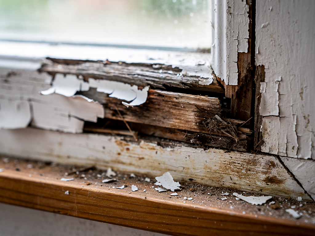 Ziet uw houtwerk eruit als de linkerfoto? Wacht niet te lang. Houtrot breidt zich snel uit. Wij herstellen de schade onzichtbaar en zorgen voor een strakke laklaag die jarenlang beschermt.